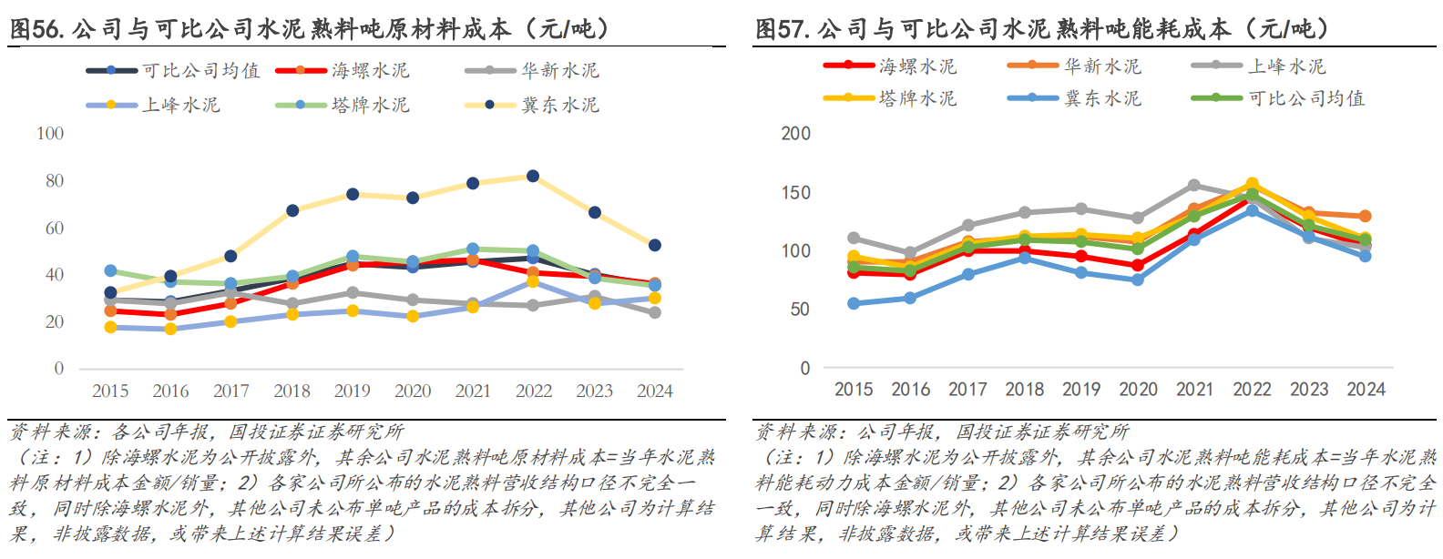 吨原材料成本和吨能耗成本均领先同行。从原材料采购成本看,多数年份公司水泥熟料自产品吨原材料成本低于可比公司平均水平,2024 年公司水泥熟料吨原材料成本为 36 元/吨,基本持平可比公司均值。从能源消耗成本来看,2018-2024 年公司水泥熟料吨能耗成本整体各年均低于可比公司均值,2018-2021 年公司吨能耗成本领先可比公司 10-16 元/吨,2022-2024年缩小至 1-4 元/吨,2024 年公司水泥熟料吨能耗成本约为 104 元/吨,较可比公司平均值低4 元/吨。