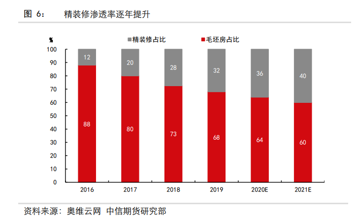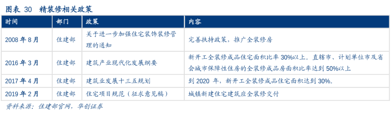 精装修房相较毛坯房而言,在新房交付前就已由地产商完成全屋硬装,一般包括墙壁、地板、厨房、卫生间等基本设施。2016 年是我国精装修市场元年。一方面,本轮精装修渗透率的快速提升离不开政策的大力推广,2017 年住建部发布《建筑业发展“十三五”规划》,宣布我国正式进入精装修时代。