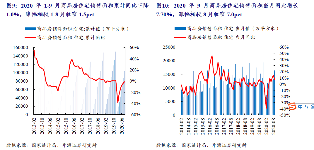 2020 年 1-9 月全国住宅商品房销售面积 103614 万平方米,同比下降 1.0%,降幅继续收窄,降幅比 1-8 月收窄 1.5pct。单月数据看,全国住宅商品房销售面积 16414 万平方米,同比上涨 7.7%,单月销售显著改善,同比提升 3.1pct。