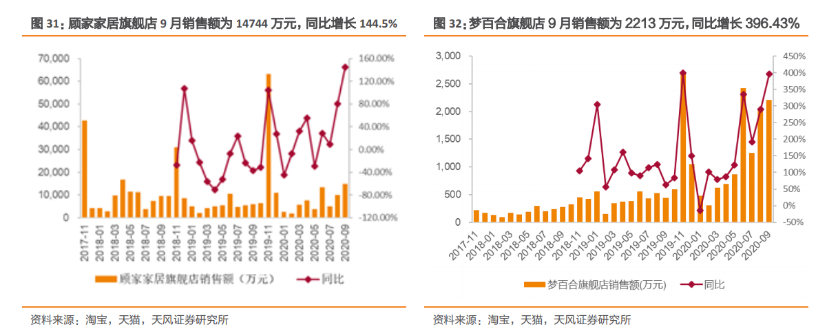 2)成品家居企业中,顾家家居旗舰店 9 月销售额为 14744 万元,同比增长 144.5%;梦百合旗舰店 9 月销售 额为 2213 万元,同比增长 396.43%;喜临门旗舰店 9 月销售额 21287 万元,同比增长 165.72%。