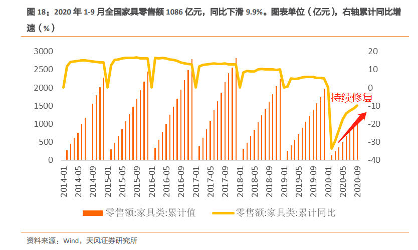 受疫情影响,2020 年 1-9 月全国家具零售额 1086 亿元,同比下滑 9.9%,但随着国内疫情逐步控制,家居零售额与增速明显持续修复。