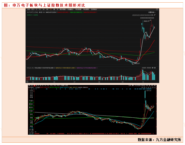 目前申万电子板块,技术图形上短期属于一个典型的老鸭头形态,在10月20号,盘中触碰新高4565点后,开始缩量调整3个交易日,目前板块整体还是处在一个震荡整理中。短期我们认为,电子板块能否突破前高,还是需要大盘的配合,相对比大盘指数来看,上证指数在同样的时空下,并还远远没有来到前高位置,而是处于3300点以下。可以看出电子板块是强过于上证大盘指数的。但是电子板块也受制于大盘,不大可能完全脱离大盘去独立去新高,电子板块整体还是需要大盘逐步企稳回升,去创新高位置。