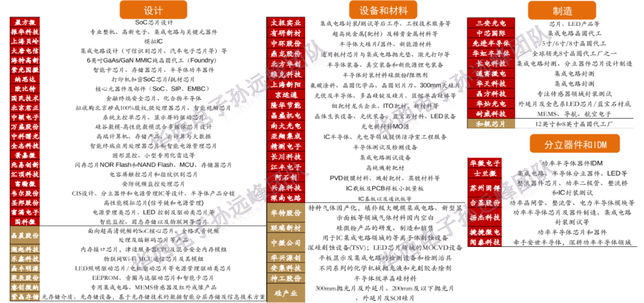 第三:半导体,主要分为设计,制造,封测,设备,和上游材料商。半导体的制造基本属于消费电子产业链的上游,半导体产业的景气度和手机和电脑等消费电子产品的销售成正相关。目前同样处于景气复苏中,但是细分环节不同复苏节奏不同,这点要特别注意,比如半导体设计环节企业,主要有射频芯片,模拟芯片,MCU芯片,soc芯片,储存芯片,功率芯片等几大类,目前射频芯片和soc芯片,功率芯片(除去IGBT),储存芯片景气度开始复苏,明年业绩会更好。但是模拟芯片,MCU芯片因为行业供给端产能相对过剩,下游需求景气度虽然有复苏,但是行业产品价格并没有很好的起来,我们预期景气度需要等到明年一季度以后。所以选股上,我们要优先选射频,功率,储存,soc芯片设计企业。半导体封测企业,业绩也开始复苏增长。至于上游半导体材料和半导体设备商,这块国产替代逻辑是主要逻辑,国产化率较低,比如光刻胶,光刻机,测试机,电子特气,刻蚀机等,这块企业基本估值都相对较高,更多是题材驱动较多,适合在电子行业景气高企时,去博弈弹性。这块可以相关白马公司:卓胜微,兆易创新,瑞芯微,士兰微,晶方科技,北方华创等。当然,半导体目前困境反转最容易出妖股,小盘+业绩差,未来的戴维斯双击空间打,相关公司比如富满微,力合微,明微电子,国科微,安路科技等
