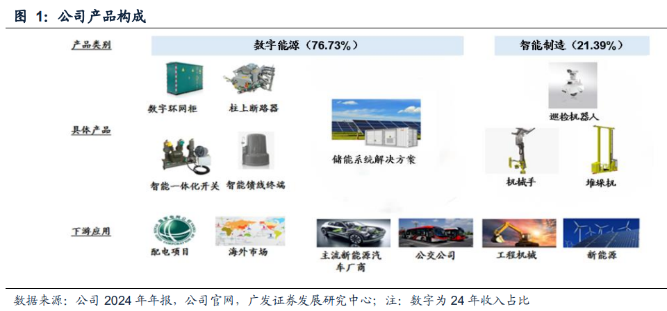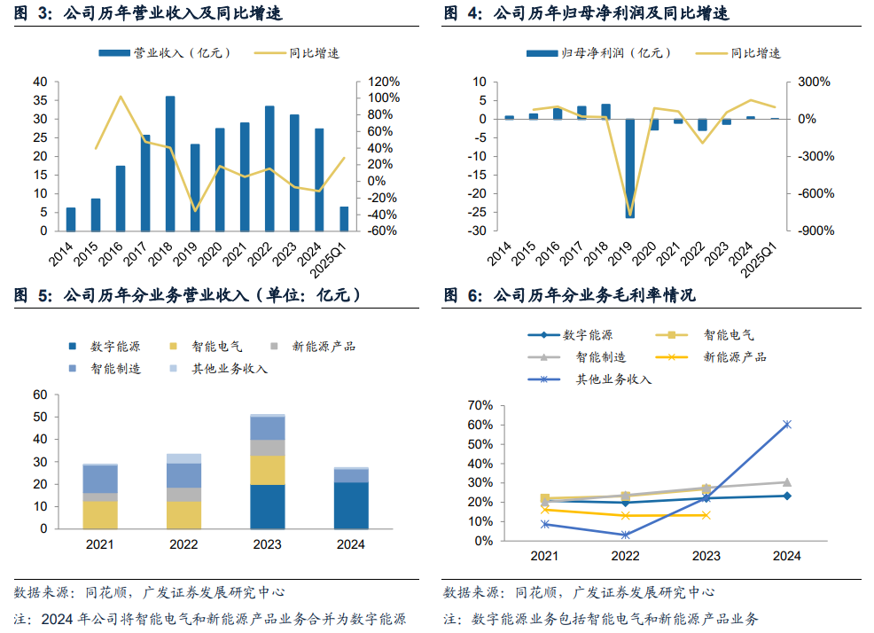 公司深耕电力能源领域,聚焦数字能源战略成效初显。公司成立于2002年,是一家深耕电力能源领域20余年,通过自主研制智能化产品集“源-网-荷-储”完整产业链布局的数字能源综合解决方案供应商,目前已形成数字能源、智能机器人应用两大业务板块。24年数字能源板块收入占比达76.71%,贡献主要收入来源。公司领先AI技术赋能电网,构建系统级智能中枢,是国内新能源行业唯一具备工业AI自主调控微电网技术并拥有大型案例的公司。24年公司实现营收27.39亿元,实现归母净利润0.7亿元,同比+154.79%,扭亏为盈。