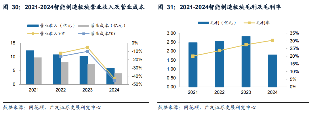 智能机器人应用板块:行业未来前景广阔,公司重整业务再出发。公司为汽车、新能源、电力、轨道交通等领域提供智能机器人产品及综合解决方案,产品矩阵丰富,能满足不同工业场景的复杂需求。24年智能机器人应用毛利率达30.37%,同比+2.86pct,盈利能力增强。