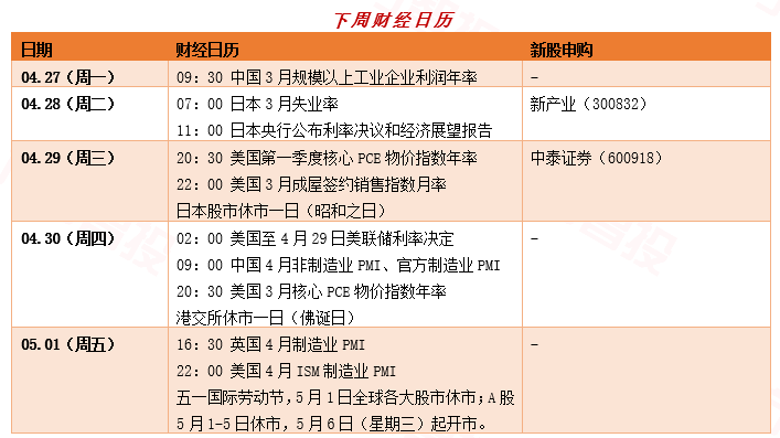 上周周评所长提到沪指只有站稳2800点才是市场逐渐企稳的信号,但本周大盘先扬后抑,周五大盘开始向下回补缺口,后市大盘继续调整的概率较高。本周沪深两市日成交额均在6000亿+,成交量仍然不活跃,有两种可能,一是临近五一小长假,假期期间不确定因素较多,资金多处于观望状态;二是机构普遍仓位较重,现在未到调仓时机。下周建议大家以观望为主,若有冲高可适当减仓。本周北向资金总体净流入较少,但周五大盘走弱后北向资金尾盘进入抢筹,可见外资还是对A股这片价值洼地十分关注,有机会就进场。