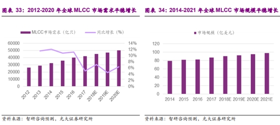 MLCC 广泛应用于消费电子、汽车电子、医疗电子、家用电器、工业控制设备、军事装备以及精密仪表仪器等领域。近年来随着电子信息技术的飞速发展,MLCC 下游市场需求持续快速增长。据智研咨询统计,2017年全球MLCC市场销量约为42000亿只,预计到2020年将达50000亿只;同时,2017 年全球MLCC市场规模为87.2亿美元,预计到2021年将达97.7亿美元。