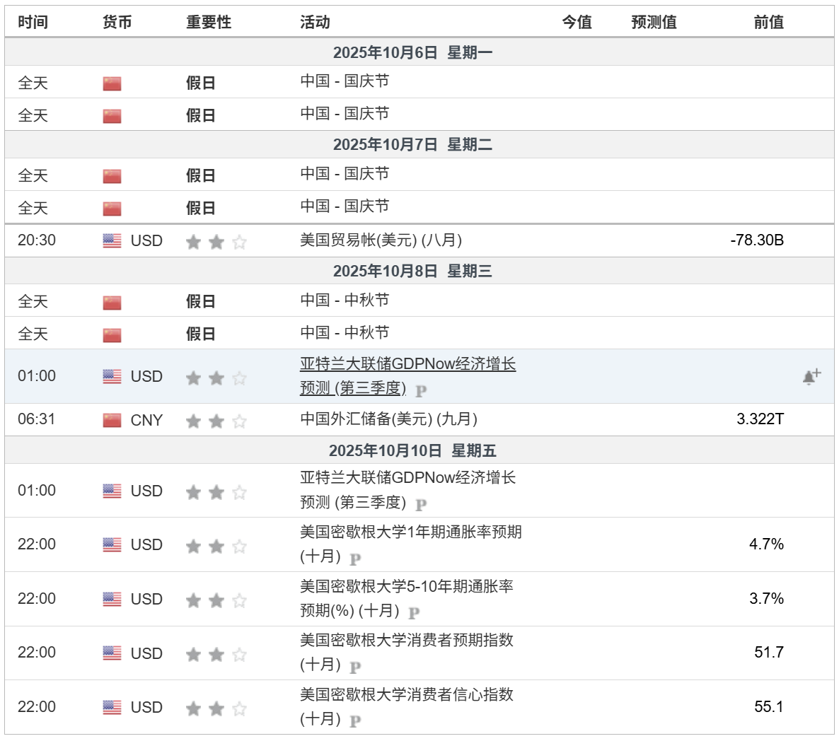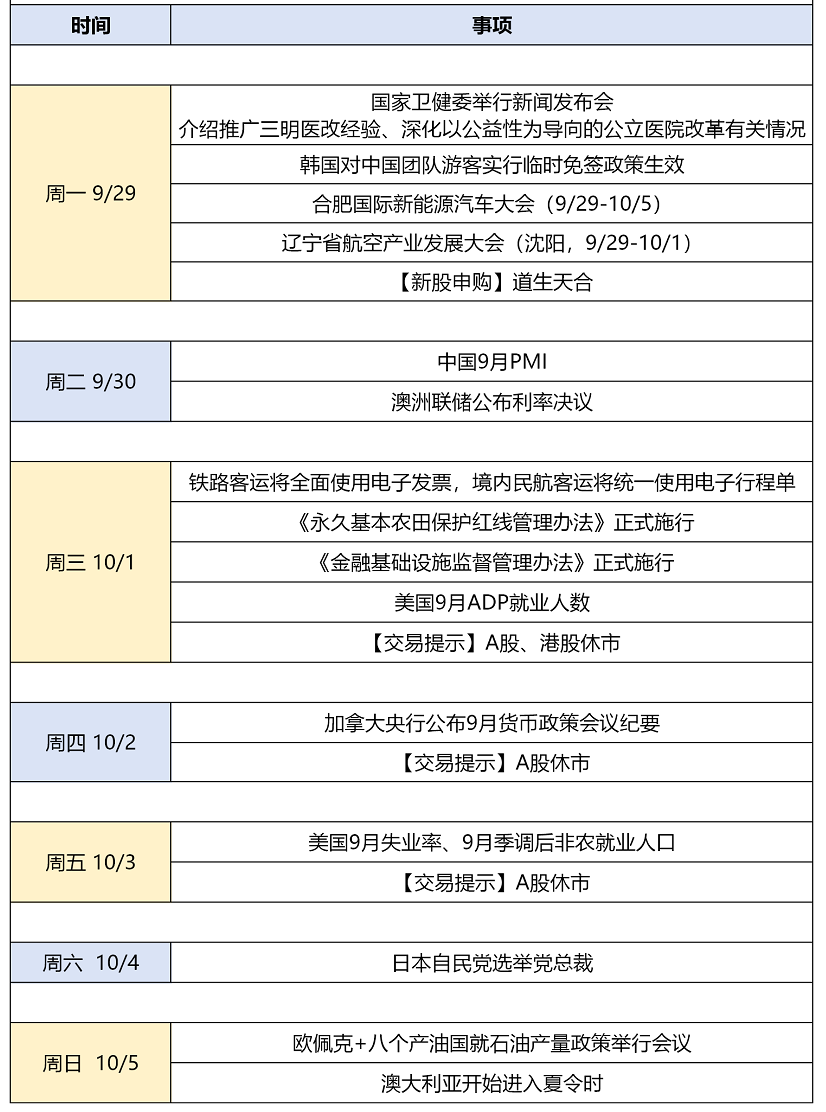 国内看,国庆期间通常处于宏观政策空窗期,2025年9月PMI数据预计在9月30日上午9:30公布,市场可能在9月30日即有所反应。