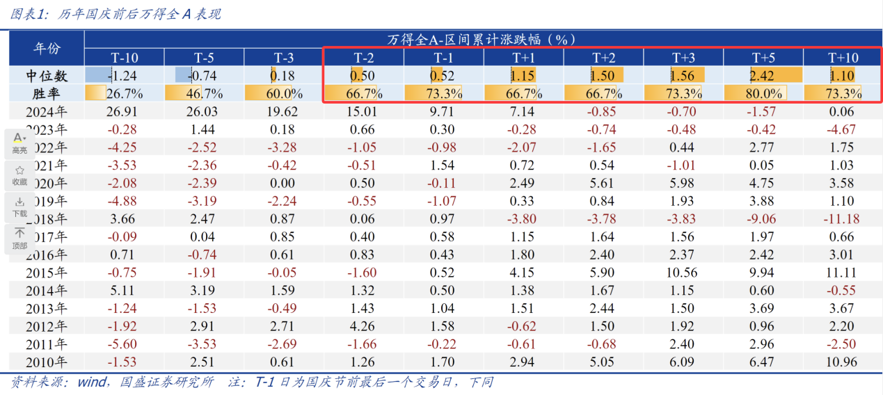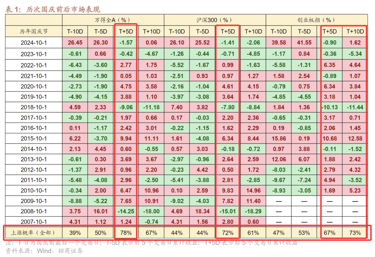 历年国庆前后A股市场表现:A股节前10日通常面临调整、节前3日内逐渐修复,节后则上涨概率较高。