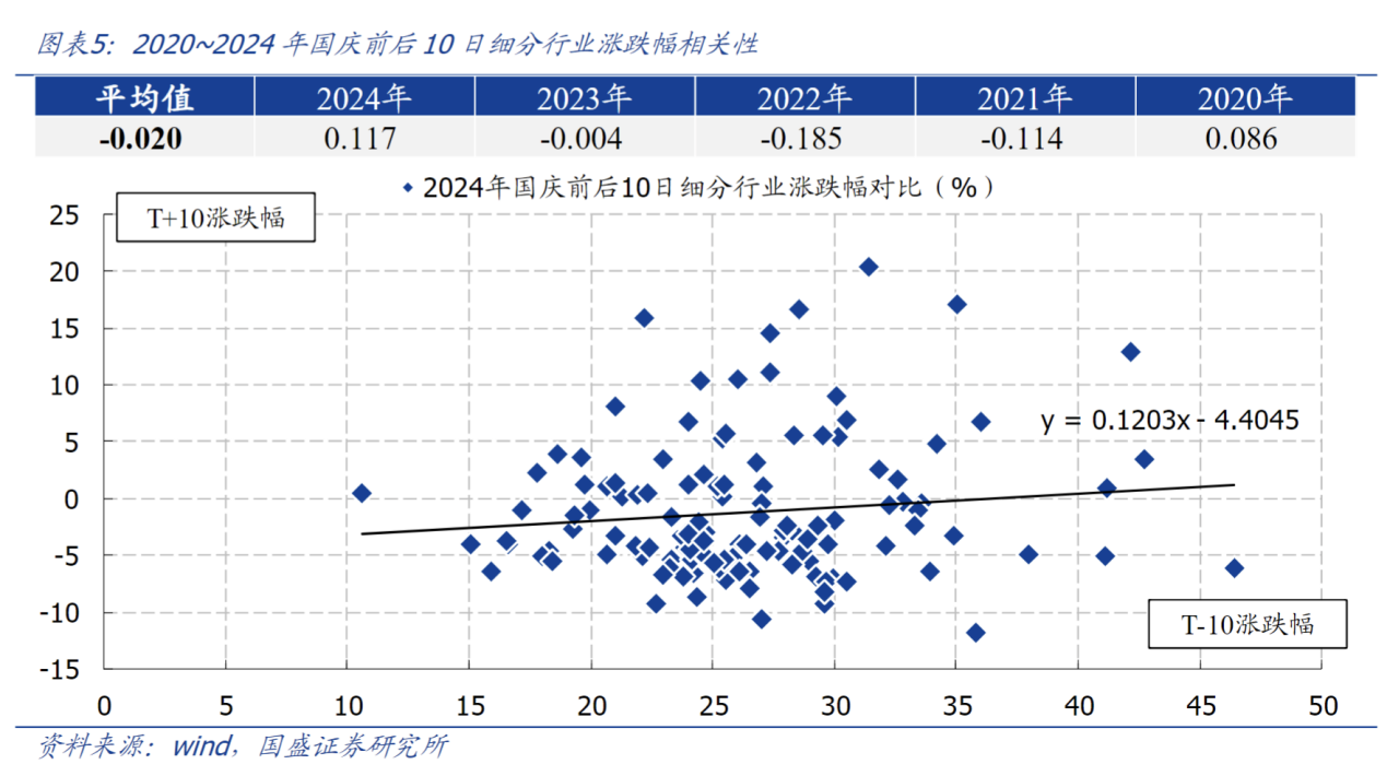 行业层面看,国庆前后领涨行业是否出现切换。统计分析看,国庆前后10日细分行业涨跌幅也不存在明显相关性,表明既不应预期国庆节前表现较好的行业在节后延续强势,也无需担忧节前表现较好的行业在节后出现兑现与调整。