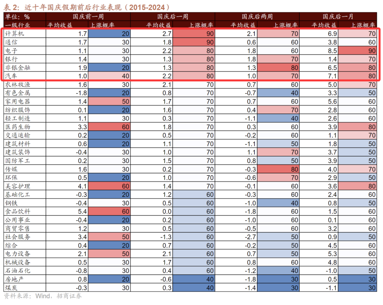 国庆节后市场风险偏好改善,主要指数往往迎来反弹。从过去十年 A 股国庆节后一周表现来看,上证指数、沪深 300、中证 1000 指数上涨概率均超 60%。行业层面,国庆后五个交易日一级行业上涨概率普遍在 50%以上,其中上涨概率靠前的行业集中在计算机、通信、电子等行业,其中银行、非银金融、汽车在国庆后两周和国庆后一个月上涨概率仍然较高。