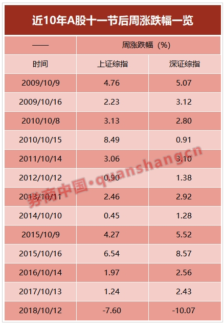 国庆节后A股涨跌幅统计数据显示:除了2018年外,过去十年当中,国庆后的第一周上证指数和深证综指几乎全线上涨,而且涨幅不小。同理,由于国庆之后第一周有时候只有一两个交易日,不具备统计意义,所以多加一周。比如,2009年、2010年和2015年。