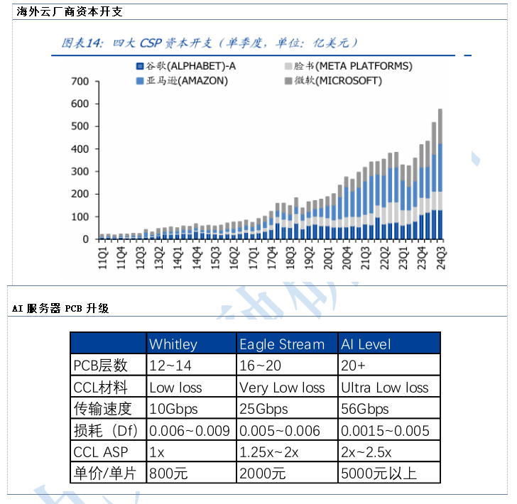 从产值看,2024年AI服务器产值预计达1,870亿美元,同比增长69%,在整体服务器产值中的占比高达65%。24Q3四大CSP((谷歌、meta、亚马逊、微软) 资本开支(现金流量表口径)总和为575亿美元,同比增长61%,环比增长11%,自23Q3 开始,云厂商资本开支逐季提升。谷歌24Q3资本支出约130亿美元,其中最大的组成部分 是对服务器的投资,其次是数据中心和网络设备,预计Q4资本支出将与Q3持平;meta24Q3 资本支出(包括融资租赁的本金支付)为92亿美元,预计2024年全年的资本支出将在380-400亿美元之间。亚马逊24Q3资本支出为213亿元,预计2024年的资本支出约为750亿美元,大部分支出用于支持对技术基础设施日益增长的需求;微软FY25Q1包括融资租赁在内的资本支出为200亿美元,PP&E支付的现金 为149亿美元,大约一半的云和AI相关支出继续用于长期资产,其余的云和AI支出主要用于服务器(CPU和GPU)。海外云厂商大幅增长资本开支,有望带动PCB需求量的增长。