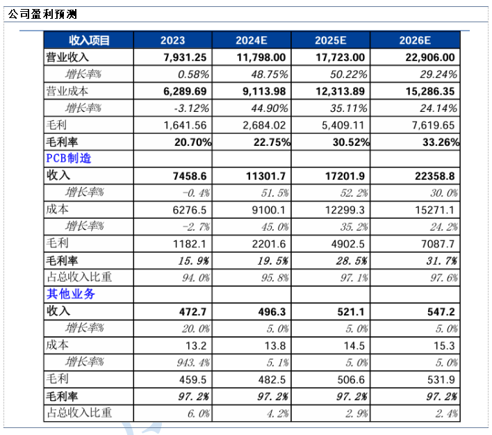 目前,服务器和汽车电子业务的增长速度最快,预计未来服务器相关市场将进入公司前三大应用领域。根据机构预计2024/2025/2026年公司实现营收分别为117.98/177.23/229.06亿元。随着AI相关新产品逐步大批量生产,公司盈利能力将迎来快速释放,高毛利率产品占比增加有望带动整体毛利率提升。预计2024/2025/2026年公司实现归母净利润为12.3/31.4/45.0亿元,按照PCB行业平均25-30倍估值,胜宏科技可以看700-1000亿市值为合理空间。