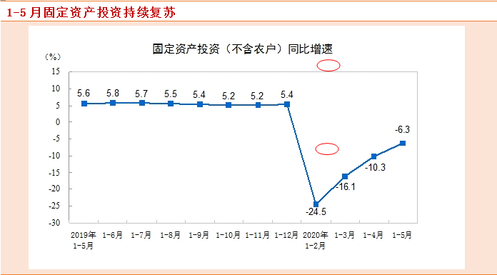 5月基建拉动明显。统计局数据显示,5月固定资产投资累计同比下降6.3%,降幅较前4个月收窄了4.0个百分点,折算当月同比为3.9%。其中地产、基建恢复相对较快,制造业仍然低迷。分领域看,基础设施投资同比下降6.3%,制造业投资下降14.8%,房地产开发投资下降0.3%,降幅分别比1-4月份收窄5.5、4.0、3.0个百分点。5月基建投资单月增长8.3%,增速继续回升。5月基建拉升主要得益于地方债放量,两会财政刺激逐渐落地,预计6月地方债仍将超预期发行,但下半年后续规模额度所剩不多,政策持续有限。制造业仍旧低迷。制造业投资累计增速回升至-14.8%,当月同比为-5.3%,仍为负增长。分产业看,第一产业投资同比持平,1-4月份为下降5.4%;第二产业投资下降11.8%,第三产业投资下降3.9%,降幅分别比1-4月份收窄4.2、3.9个百分点。可见低端制造业是主要拖累,由于疫情的影响很多企业还未开始盈利,短期制造业投资的回暖仍受一定制约,不过结构来看,高技术产业投资增长已经回正。房地产投资恢复较快。单纯需求端来看,前5月商品房销售面积同比增速回升至-12.3%,当月增速已回正,销售回暖体现的是需求积压情况下的短期释放,但金融数据中的居民中长期贷款仍维持低位,反映预期收入下降后长期需求依然不足。