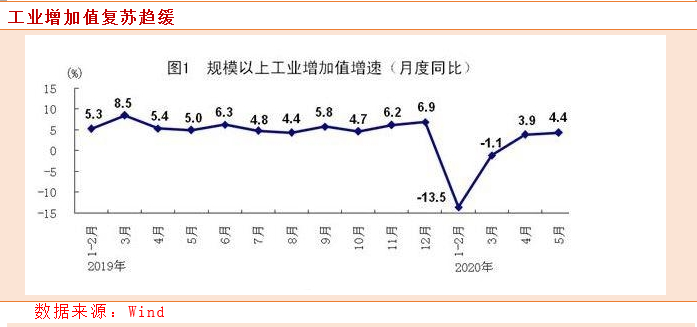 工业增加值持续恢复。根据国家统计局公布的最新数据,5月工业增加值同比增速4.4%,较上月加快0.5个百分点。具体来看,41个大类行业中有30个行业实现同比增长。其中高技术和装备制造业增长较快,同比分别增长8.9%和9.5%。从产品来看,基建加快推进带动相关产品生产加快,如挖掘机、铲土运输机械同比增长62.1%和22.3%,原材料方面水泥、钢材同比分别增长8.6%和6.2%。1-4月份,全国规模以上工业企业实现利润总额12598亿元,同比下降27.4%,降幅比1-3月份收窄9.3个百分点;4月份,规模以上工业企业利润总额同比下降4.3%,降幅比3月份收窄30.6个百分点。下游消费品齐齐回升。在前期防疫物品出口保持强势的带动下,纺织业增速连续两个月回升并保持正增长,汽车制造业增速连续第二个月大幅回升至12.2%,创2018年6月以来新高,产量同比增速继续显著回升,较4月提高13.9个百分点至19%,创2016年9月以来新高;但医药制造业自3月高点连续第二个月回落至2.0%,为2006年有记录以来新低。工业生产恢复速度放缓。相较于上月,大多数行业复工复产恢复程度有所放缓。主要原因在于供给端修复接近尾声。据统计,截至5月27日,67.4%的规上工业企业达到正常生产水平八成以上,继续修复动能不足。与此同时,需求不足开始凸显。服务业生产也开始转正,但动力不足。其中信息技术、房地产和金融业生产指数同比增长继续加快,批发零售和住宿餐饮同比仍下降。6月或将进一步放缓。根据高频指标显示,5月6大发电集团日均耗煤量同比增长7.1%,今年以来首次转正,6月前半月依然维持正增长,但增速放缓至1.2%。5月高炉开工率为70.13%,为去年下半年以来的最高水平,6月前半月继续保持在70.58%的较高水平。但由于供给端复苏接近完成,后续动力不足,且海外疫情仍在蔓延,外需前景持续暗淡,内需也受到近期北京疫情反复的冲击,预计6月工业生产复苏较弱。