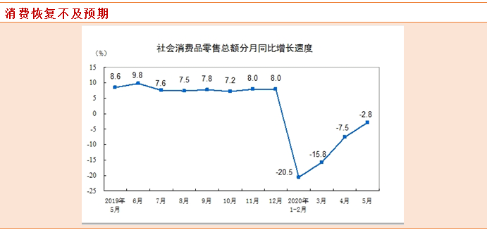 报复性增长迟迟未到。5月份,社会消费品零售总额同比下降2.8%,降幅较上月收窄4.7个百分点,但不及预期-1.5%;扣除价格因素实际下降3.7%,降幅较上月收窄5.4个百分点。5月社会零售依然为负其低于预期,意味着此前寄以厚望的报复性增长尚未出现,各地政府通过各种政策刺激夜间消费效果存疑。必需品消费拉动明显。从各类限额商品零售来看,必需品消费仍然高增长,其中粮油食品、饮料、烟酒和日用品同比增长均超过10%。可选品消费也有所回暖,地产销售回升带动家电、家具和建筑装潢消费同比正增长。餐饮和非必需品依旧低迷。从数据来看,5月餐饮收入同比下降18.9%,降幅也有所收窄。本月消费主要由汽车等限额以上消费拉动,短期呈现恢复,但疫情仍存在不确定性,低端消费依旧低迷,海外疫情影响对出口的冲击尚未完全体现,居民未来收入下滑预期犹存,仍会对未来消费构成制约。下一阶段预计消费支撑减弱。从5月通胀数据来看,目前通缩风险较大,猪肉价格持续下行,且汽车等限额以上消费品将进入淡季,前期国六标准促销阶段已过,基数也被推高。北京地区疫情反复的冲击也会减弱线下消费的意愿,预计6月消费将维持在-1%附近。