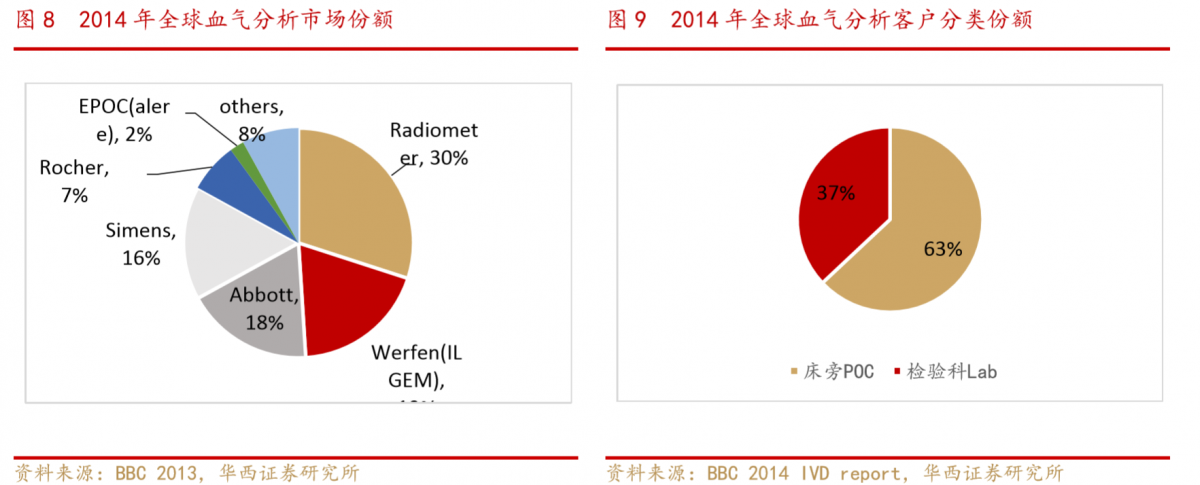 从全球看,2017年,血气分析市场约30亿美元,行业增速5%,从市场份额看,依次是雷度米特、沃芬和雅培,根据市场规模和份额测算,雅培的i-stat市场规模在5.4亿美元。血气分析作为检验业务,以前主要是在检验科里完成;随着POCT的兴起,血气检测本身对检测时效性的要求,外加技术成熟后产品成本的降低,临床科室开始大规模开展床旁血气分析,POCT血气分析逐渐占据主流。