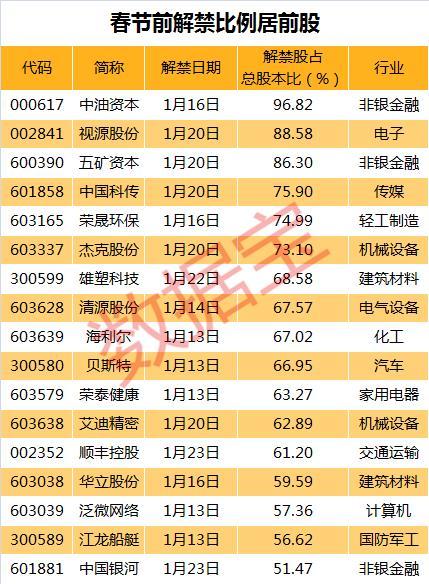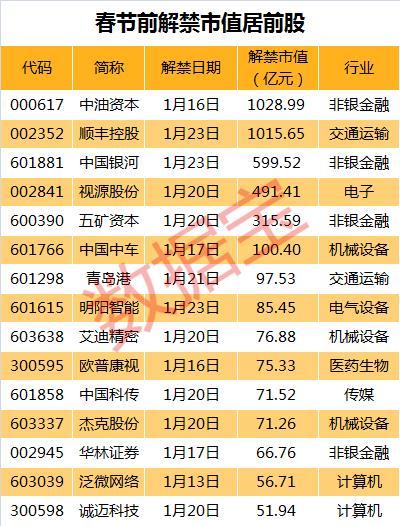 从个股来看,春节前有105股面临解禁,其中15股解禁市值超50亿元,包括中油资本、顺丰控股、中国银河、视源股份等。