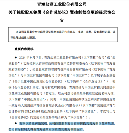 ►继中国船舶与中国重工合并后,国企整合重组又有大消息。9月8日晚,盐湖股份披露,公司实控人青海省政府国资委、控股股东青海国投与中国五矿及下属子企业签署《关于组建中国盐湖集团合作总协议》。青海省政府国资委、青海国投与中国五矿拟共同组建中国盐湖工业集团有限公司,若本次转让实施完成,盐湖股份控股股东将由青海国投变更为中国盐湖集团,公司实控人将由青海省政府国资委变更为中国五矿。对于此次权益变动的目的,公司表示,是为加快共建世界级盐湖产业基地,打造世界级盐湖产业集团。对于新组建的中国盐湖集团,有网友类比此前的“中国神车”“中国神船”,称这次是“中国神湖”来了。业内看来,随着此次中国五矿的深度参与,未来五矿盐湖与盐湖股份旗下的资源整合也或提上日程,青海盐湖资源整合或是最大看点。