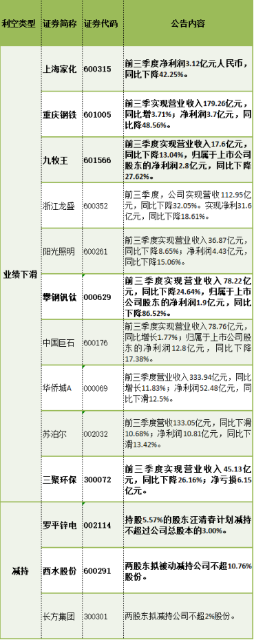 10月26日,西水股份公告,中泰证券拟对公司持股10.75%股东绵世方达质押的公司部分股票进行违约处置,计划自公告发布之日起15个交易日后的180个自然日内,通过集中竞价交易和(或)大宗交易方式,减持不超过6558万股公司股份,占总股本6%。股东北京新天地互动多媒体技术有限公司拟被动减持不超5200万股公司股份,占总股本4.76%.