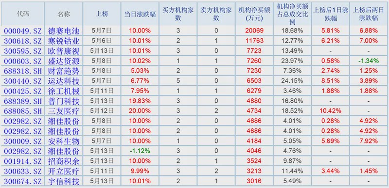 又如新能源汽车板块德赛电池,该股在5月6日、7日股价收获两连板,这两个交易日的龙虎榜显示,机构资金同样出现连续扫货。其中,6日有两家机构席位合计买入德赛电池2754万元,7日更有3家机构席位合计买入2.01亿元。