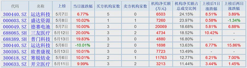 例如,运达科技5月6日、7日连续获机构席位大举扫货:6日获两家机构席位买入1698万元,7日获5家机构席位买入6503万元。从后续表现来看,运达科技股价迅速止跌企稳,5月8日大涨8.51%。