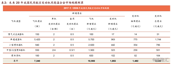 2018年,全球高温合金市场规模为121.63亿美元,同比增长4.8%,其中,航空航天占55%。而基于前文对军用和民用航空发动机未来市场规模的分别预测,同期对应的高温合金材料需求分别将达到291亿元&233亿元和259亿美元&208亿美元。