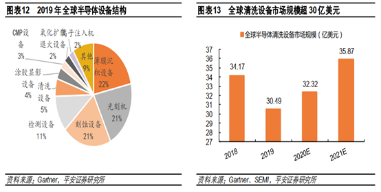 2019年全球半导体清洗设备市场超30亿美元,占全部设备的5%。竞争格局方面,全球领先企业CR3接近90%,其中迪恩士是绝对龙头,19年全球份额占比50%。而国内半导体清洗设备企业正在多方位追赶。