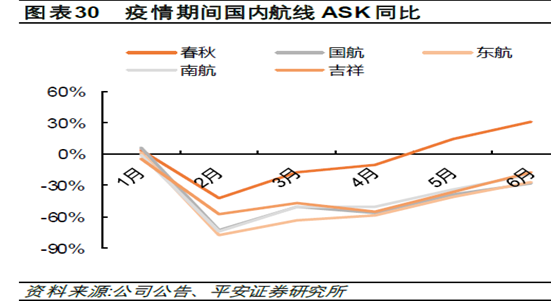 春秋航空:公司是国内首家低成本航空公司。区别于全服务航空公司,公司凭借价格优势吸引大量对价格较为敏感的自费旅客以及追求高性价比的商务旅客构成的细分市场。疫情爆发以来,公司积极拓展国内航线市场,5-6月国内航线ASK同比实现正增长,在可比上市公司中,在国内航线RPK和客运量上春秋航空是唯一一家实现单月同比正增长的公司,且客座率水平依然领先。
