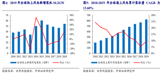 长期来看,全球风能资源丰富,风力发电成长空间巨大。2019年全球陆上风电新增装机量为54.2GW,同比+16%,中国占比达到44%,中国、印度风电市场崛起。而海上风电装机目前规模小,截至2019年底全球海上风电累计装机量为29294MW,2010年至2019年同比+26.41%。
