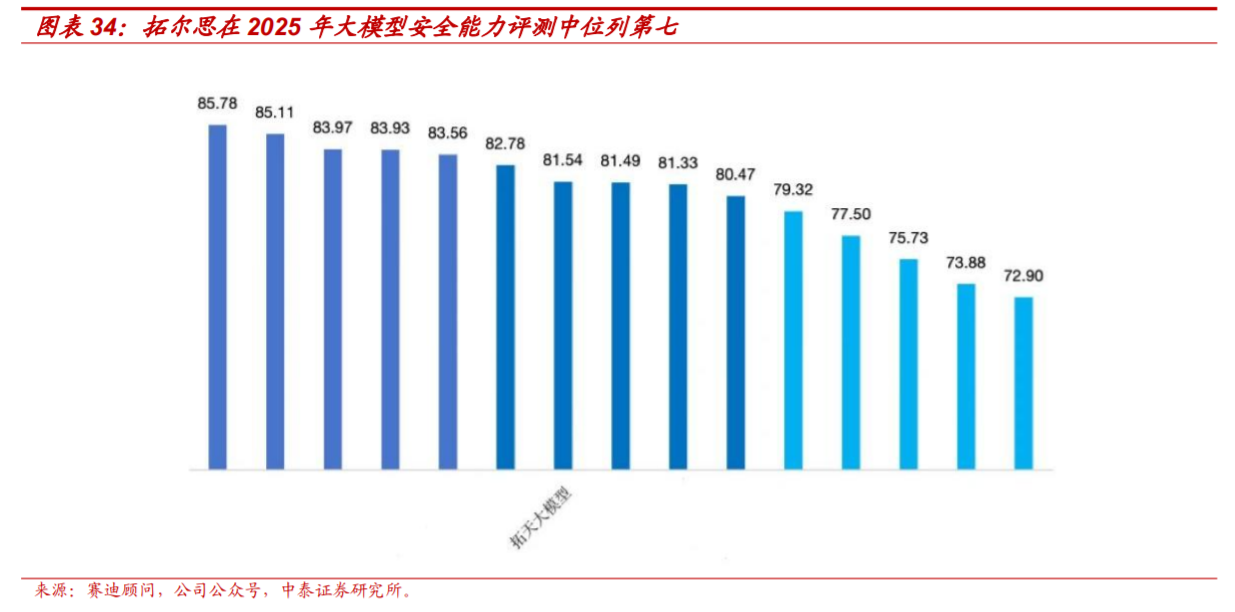 拓尔思技术中台&大模型安全能力:拓尔思技术中台实现自动化部署、实时升级和运维保障的高可用性与低成本运行。根据赛迪顾问推出的《2025中国大模型安全能力测评报告》,拓尔思自主研发的拓天大模型凭借全生命周期安全防护能力,位列第七,从数据集构建、模型调优、主动防御、场景落地等方面实现了覆盖生命周期全流程的安全防护服务。