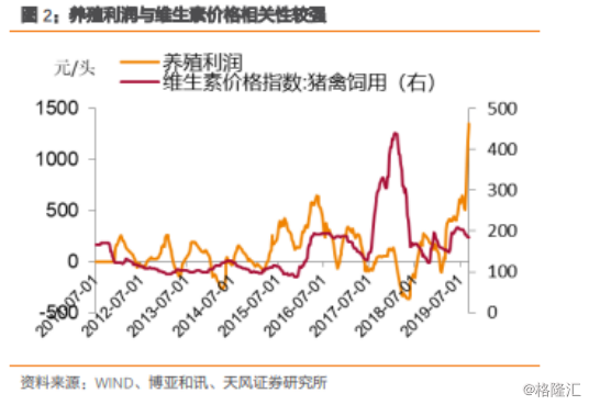 据了解,维生素作为添加剂,占饲料成本比重很低,供需一旦错配价格容易暴涨暴跌。剔除单个品种的波动,维生素整体价格水平从历史看跟随养殖景气周期波动,与生猪养殖利润存在高度相关。作为养殖后周期品种,猪肉价格上涨带动存栏量和饲料需求回升进而带动维生素价格上涨,而随着消费旺季来临,目前正是积极布局维生素板块的合适时机,并且看好VA、VE和生物素的价格。