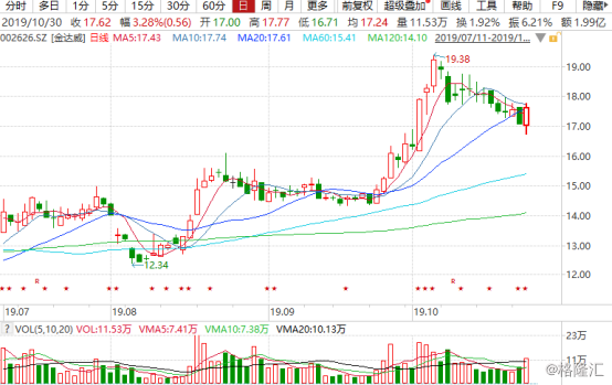今日午后,饲料维生素概念股金达威(002626.SZ)直线拉升,股价由跌转涨,截至收盘其股价上涨3.28%至17.62元,振幅高达6.21%,最新总市值为108.62亿元。