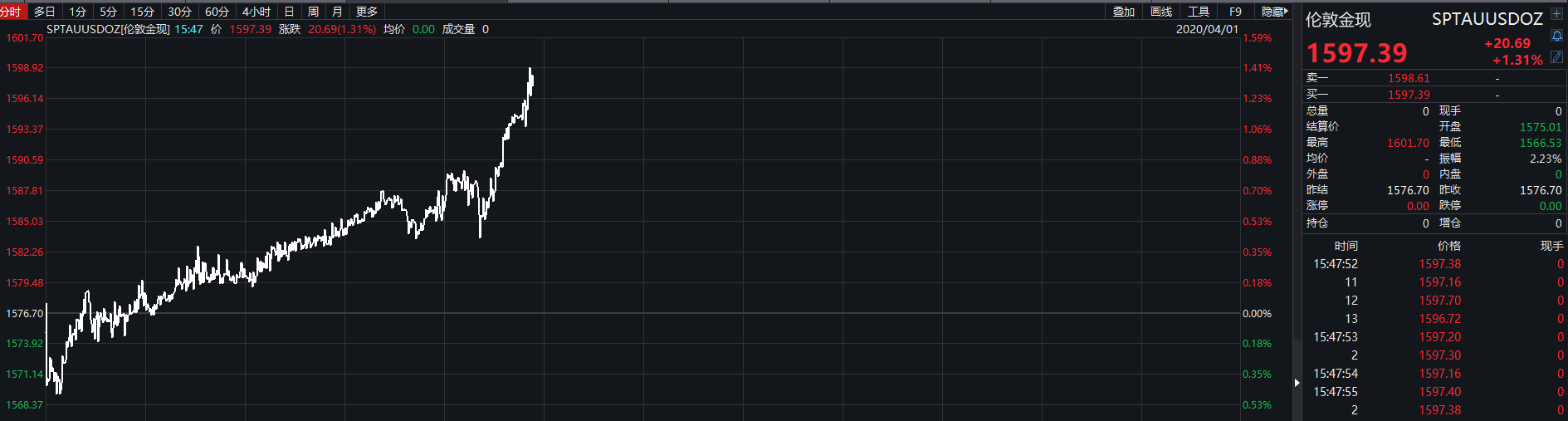 今日,现货黄金盘中突破1590美元/盎司,最高达1597美元/盎司,日内涨幅超1.2%。