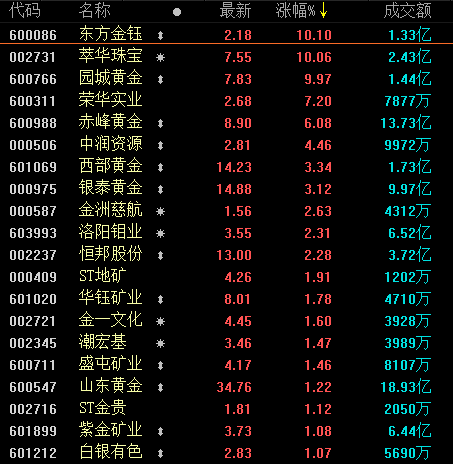 A股方面,受现货黄金大涨利好,黄金板块尾盘发力拉升,截至收盘,东方金钰、翠华珠宝、园城黄金等涨停,荣华实业涨逾7%,赤峰黄金涨超6%。