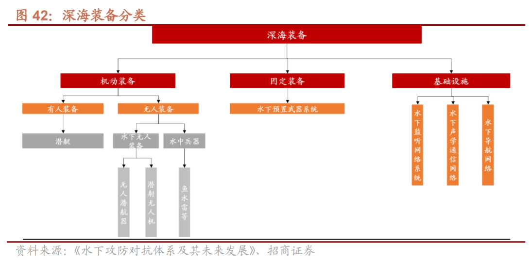 据解放军报发布的《呼之欲出的深海空间作战》,深海具有独特的战场空间攻防作战优势,是军事力量对抗最具潜力的战略空间之一。随着深海科技发展和在军事领域的广泛应用,深海作战隐蔽性强、溯源难、节奏快等特征愈发突显。根据深海对抗能力及装备形式,可将深海装备分为:机动装备、固定装备以及基础设施。