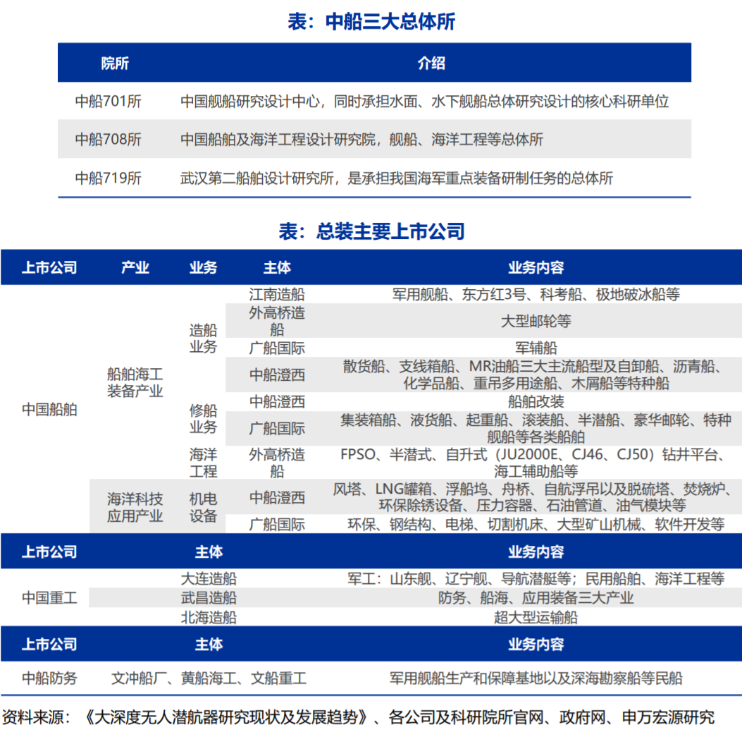 有人水下装备:我国有人水下装备总体单位主要为中国船舶、中国重工和中船防务三大上市公司以及701、708、719三所。