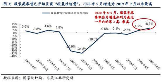 数据显示,2020年8月/9月服装零售额当月增速分别为4.2%/8.3%,分别为2019年9月以来的第二高/最高值,这是需求开始复苏的一个体现。