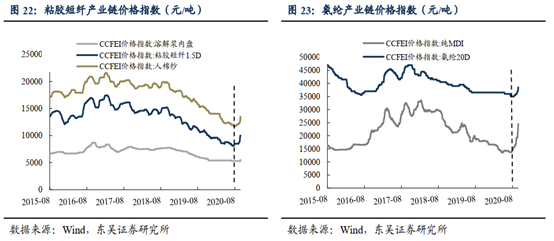 与此同时,纺服需求复苏向上传导,上游粘胶短纤和氨纶也存在结构性机会。8月份以来粘胶短纤累计上涨23%;氨纶结束三年下跌的趋势并开始反弹。