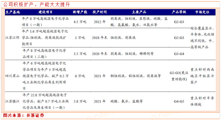 四川基地配套产品主要服务西南面板客户。公司在四川布局6 万吨超高纯湿电子化学品,配套3.2 万吨再生循环项目,重点针对西南地区平板显示客户,截至2021H1,四川基地6 万吨已投料试生产。随着公司多个项目的产能释放,公司成长动力充足。