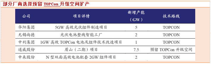 由于TOPCon现阶段转换效率已能够达到24%以上并且相较HJT产线单GW投资额更小,下游厂商例如尚德、中来、通威等新建产能选择TOPCon技术路线。