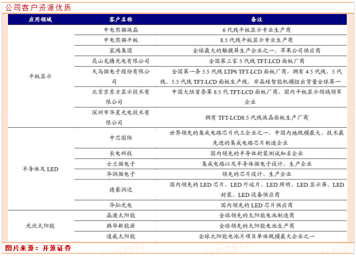 分产品应用领域来看,公司收入主要分布于平板显示、半导体和光伏太阳能。