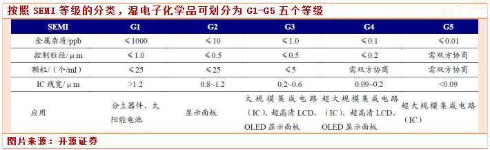 按照SEMI等级的分类,湿电子化学品可划分为G1-G5五个等级。应用领域不同,对微电子化学品的纯度要求也有所不同: