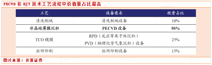 HJT设备中PECVD价值量占比最大、技术含量最高。在异质结生产设备中,PECVD价值量占比最大,其投资占比约为整线价值量的50%。