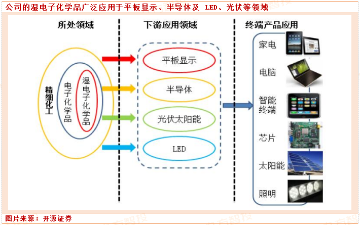 在平板显示领域,公司已为6 代线、8.5 代线等高世代线平板显示生产线供应高端湿电子化学品,逐步实现进口替代,在平板领域主要客户包括熊猫、京东方、中电彩虹、宸鸿集团、龙腾光电、深天马、华星光电等。