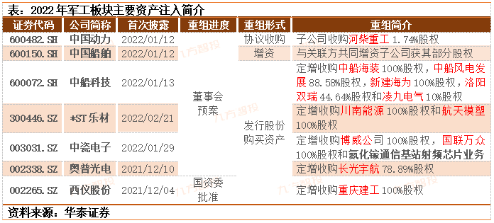 最后,国内军工资产整合优化持续推进,2022年有望成为上市平台资产结构优化大年。纵观我国军工行业发展历程,专项领域方向上的优势资源整合是“十三五”以来的产业资产运作重点,中航发集团的剥离成立、“南北船”的合并重组、中核集团的合并重组等都是实例。眼下,随着军工行业层面的资产优化整合告一段落,A股上市平台的资产结构优化正在成为新的着力点。