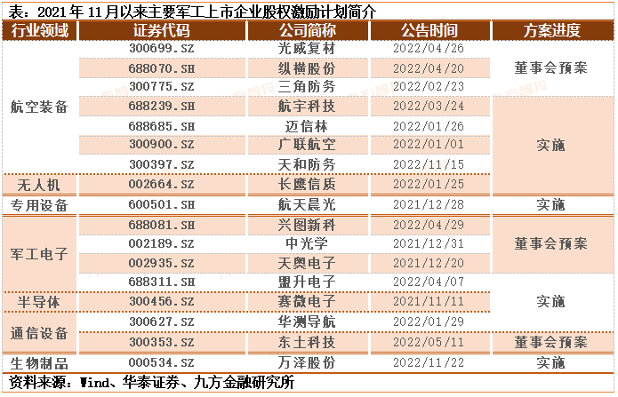 在激励制度方向上,包括股权激励在内的多元化激励体制探索同样值得关注。从传统的股权激励方面来看,A股军工板块亦有望在2022年开始迎来新一轮股权激励的高峰。机构统计显示,2021年11月以来,国防军工板块中共有17家企业发布了股权激励计划预案;其中,航空装备与军用电子领域的上市公司占据绝对多数。