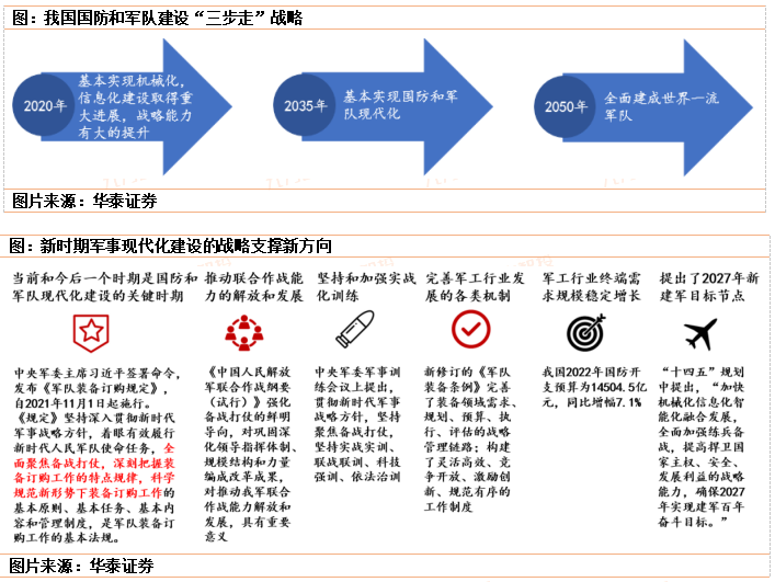 依照我国军事现代化建设规划,国内军工行业发展已经迈入的新的阶段。综合十九大以及《国防白皮书》制定的新时代中国国防和军队建设战略目标,中国军事力量的现代化建设计划将以2020年、2035年和2050年为节点实现“三步走”的战略目标。