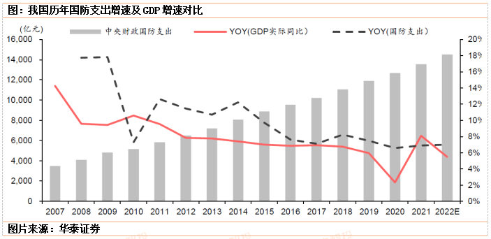 着眼国内,强国必先强军主线坚定不移,军工是伟大民族复兴的必然要求。数据显示,自2010年以来,除2021年受到疫情等因素影响以外,我国的国防支出一直以高于经济增速的速度稳步增长;新世纪以来的国防建设一直是国家重点投入的方向。根据今年的全国人大会议预算草案,2022年中国军费预算拟达到14,504.5亿元,同比增长7.1%;我国军费预算自2019年以来增速首次突破7%。